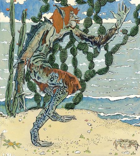 Le personnage monstrueux de Caliban est issu de la pièce La Tempête, de Shakespeare. Caliban, fils de la sorcière Sycorax, incarne une forme de bestialité qui permet à l’illustratrice britannique Pixie de libérer toute son imagination ; mais les lecteurs modernes y voient aussi un exemple d’oppression coloniale.
